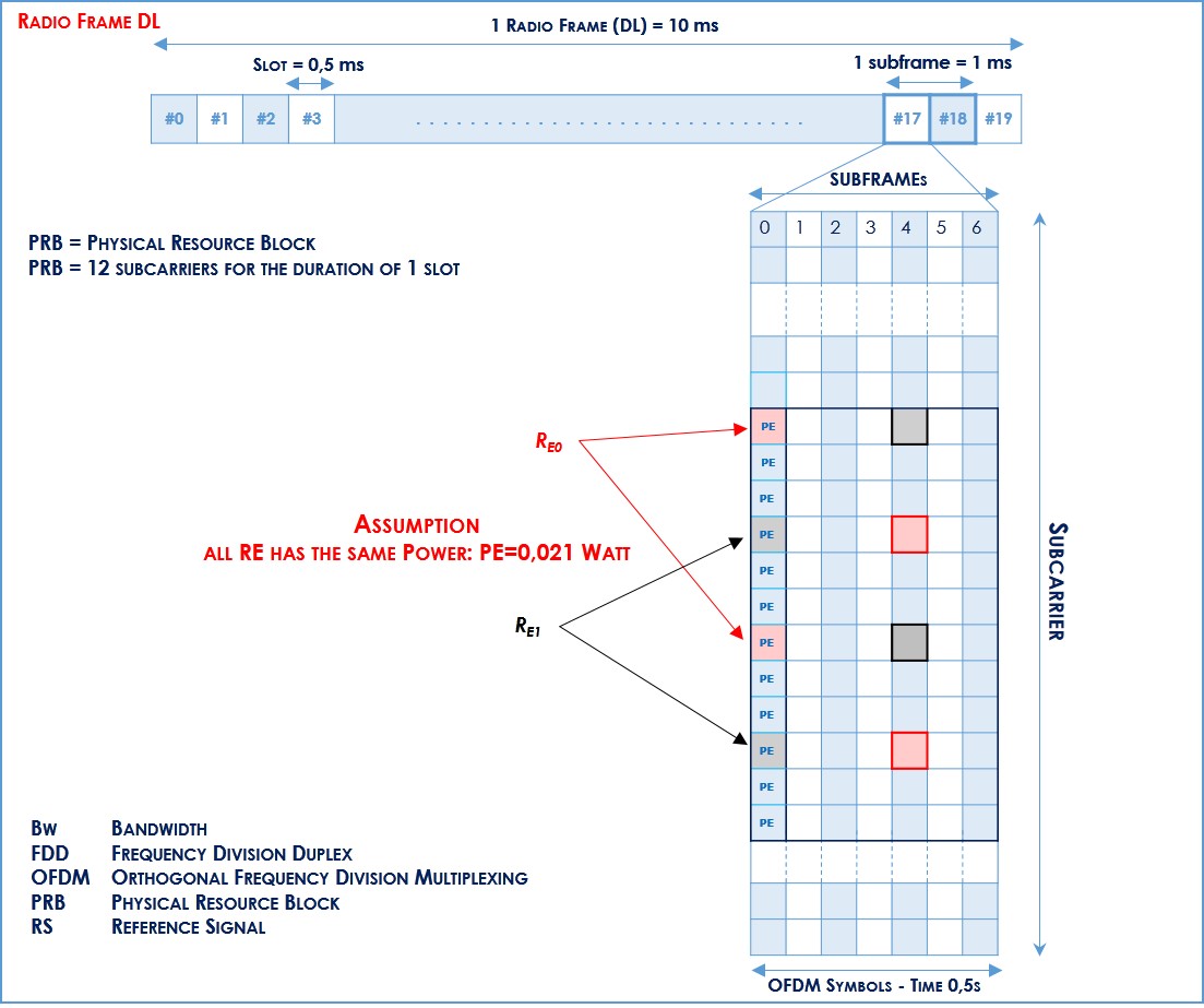 - RSRP is the received power of 1 RE (3GPP definition) average of power levels received across all Reference Signal symbols within the considered measurement frequency bandwidth